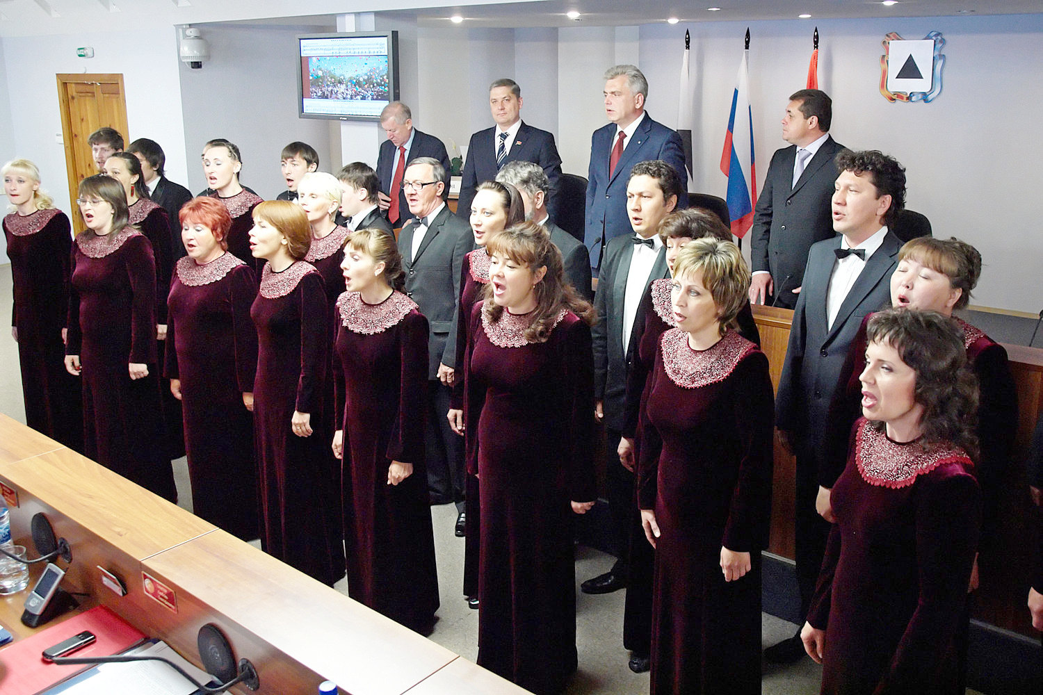 Председатель городского Собрания Александр Морозов обратил на это внимание собравшихся: « В этих стенах гимн нашего города профессионально исполняется третий раз. Впервые он прозвучал здесь в мае 2011 года в исполнении камерного хора Дома музыки. Именно тогда городское Собрание утвердило гимном известную песню Александры Николаевны Пахмутовой и Николая Николаевича Добронравова.