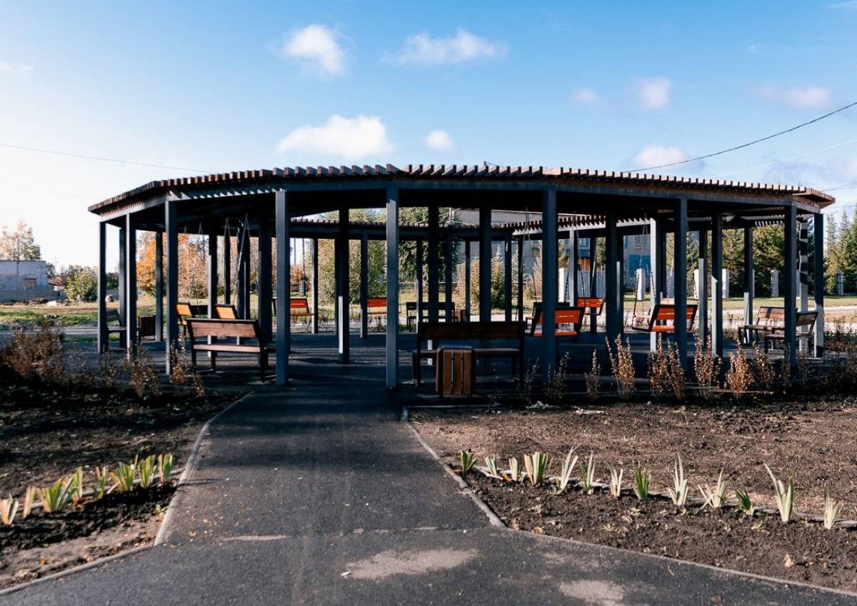 На территории пешеходной зоны была выстроена уютная пергола с многочисленными скамейками и качелями, заасфальтированы пешеходные дорожки.