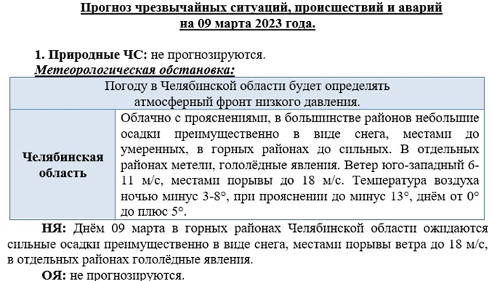 По данным Челябинского ЦГМС, днем 9 марта в горных районах ожидаются сильные осадки, преимущественно в виде снега, местами порывы ветра до 18 м/с, в отдельных районах гололедные явления. Предстоящей ночью в регионе будет минус 3-8, при прояснении – до минус 13, завтра днем прогнозируется от нуля до плюс пяти.