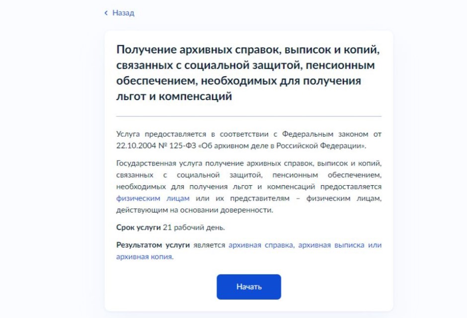 Граждане могут получить услугу «Организация исполнения государственными архивами субъектов Российской Федерации запросов на получение архивных справок, архивных выписок и архивных копий, связанных с социальной защитой граждан,