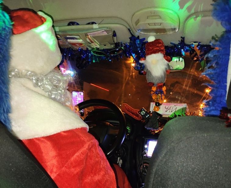 Водитель украсил автомобиль как внутри, так и снаружи. А сам таксист сидит за рулем в образе Деда Мороза.