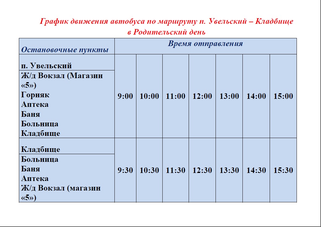 Уважаемые жители п.Увельского! В Родительский день, 14 мая 2024 г., Увельским АТП будет организовано движение автобуса, на котором все желающие могут доехать до кладбища.