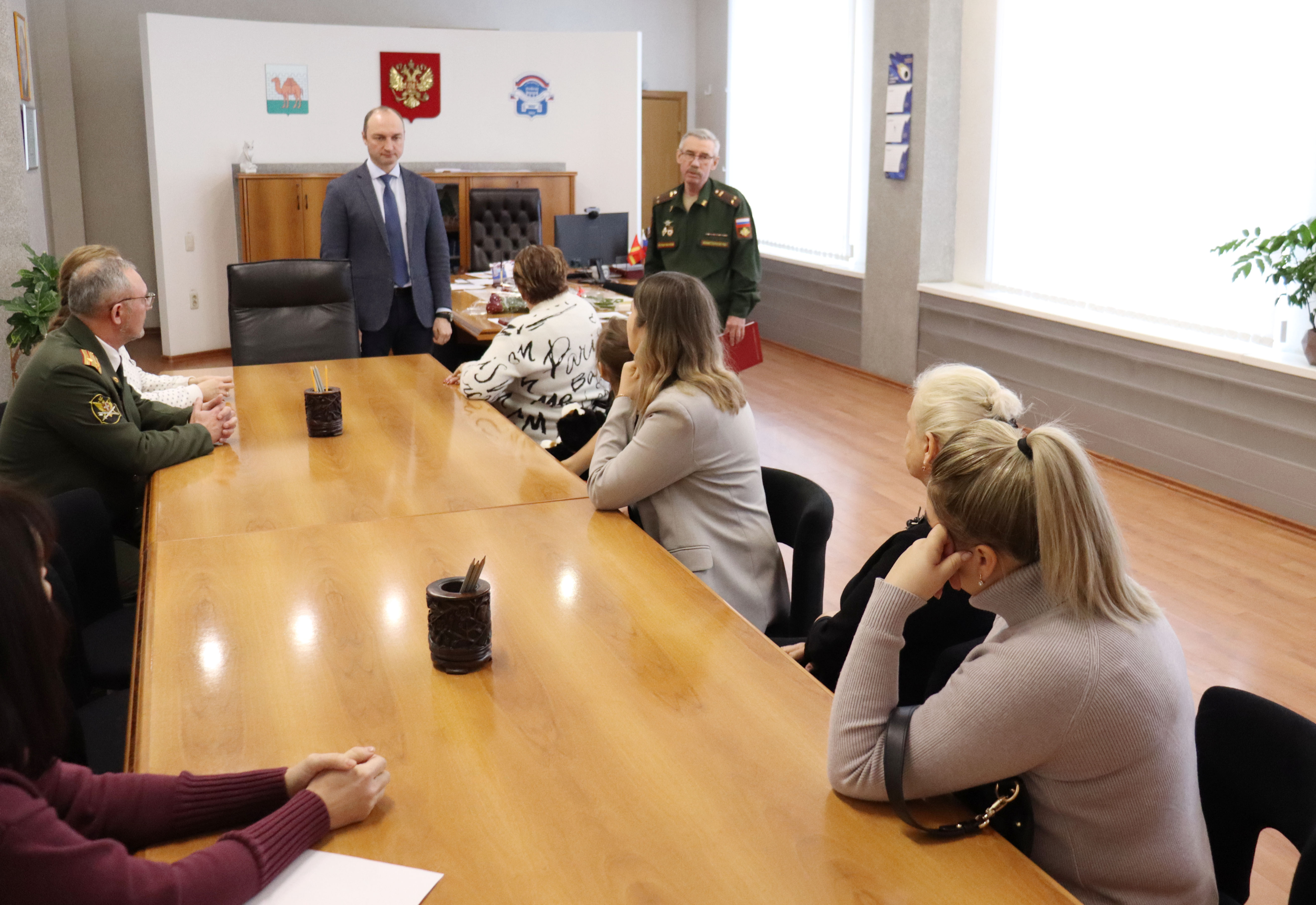 Глава района Юрий Кузнецов вручил Орден Мужества и удостоверения к Орденам родным и близким участников специальной военной операции из Тракторозаводского района.