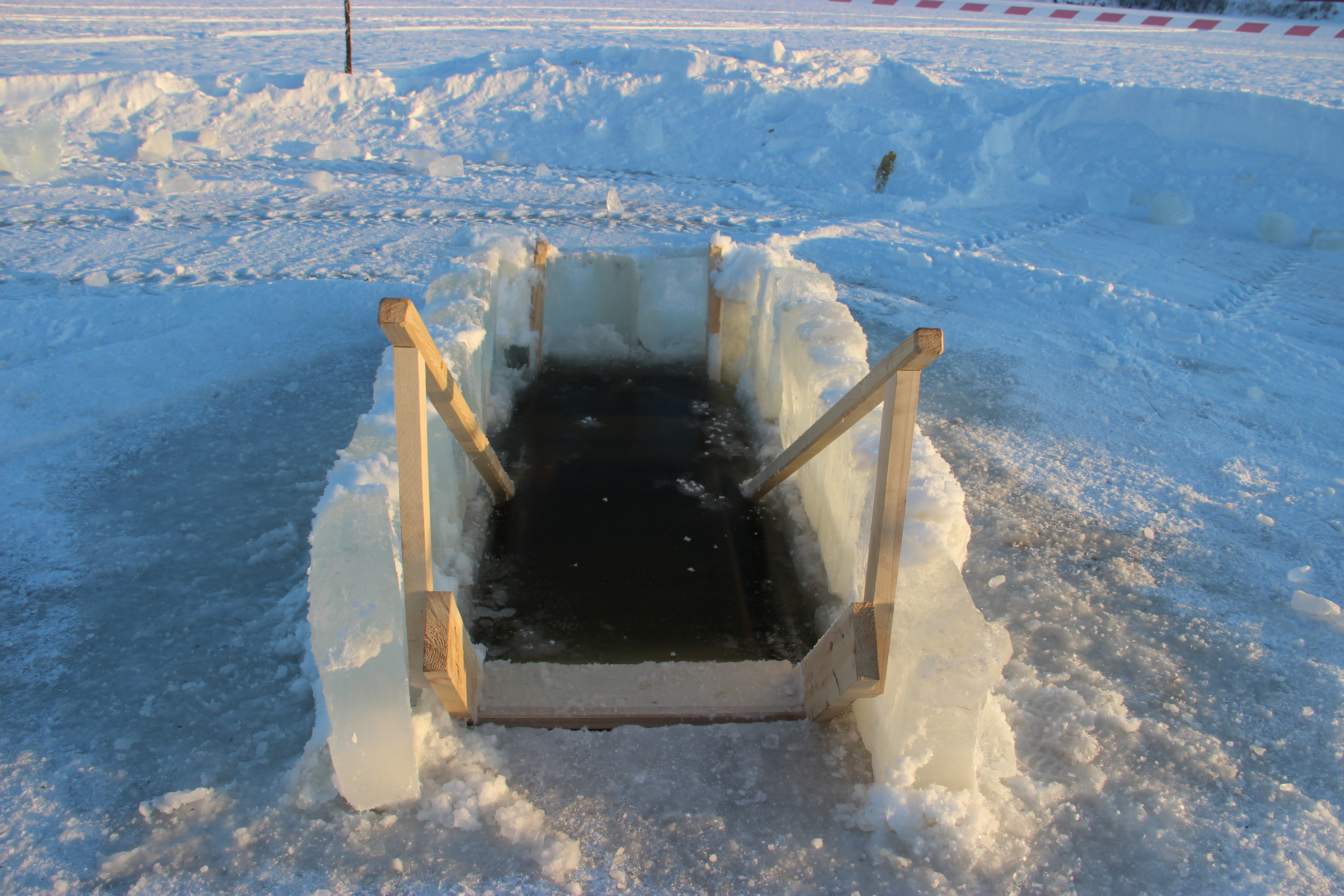 Нырять в прорубь вниз головой, распивать спиртные напитки до и после купания категорически запрещено.